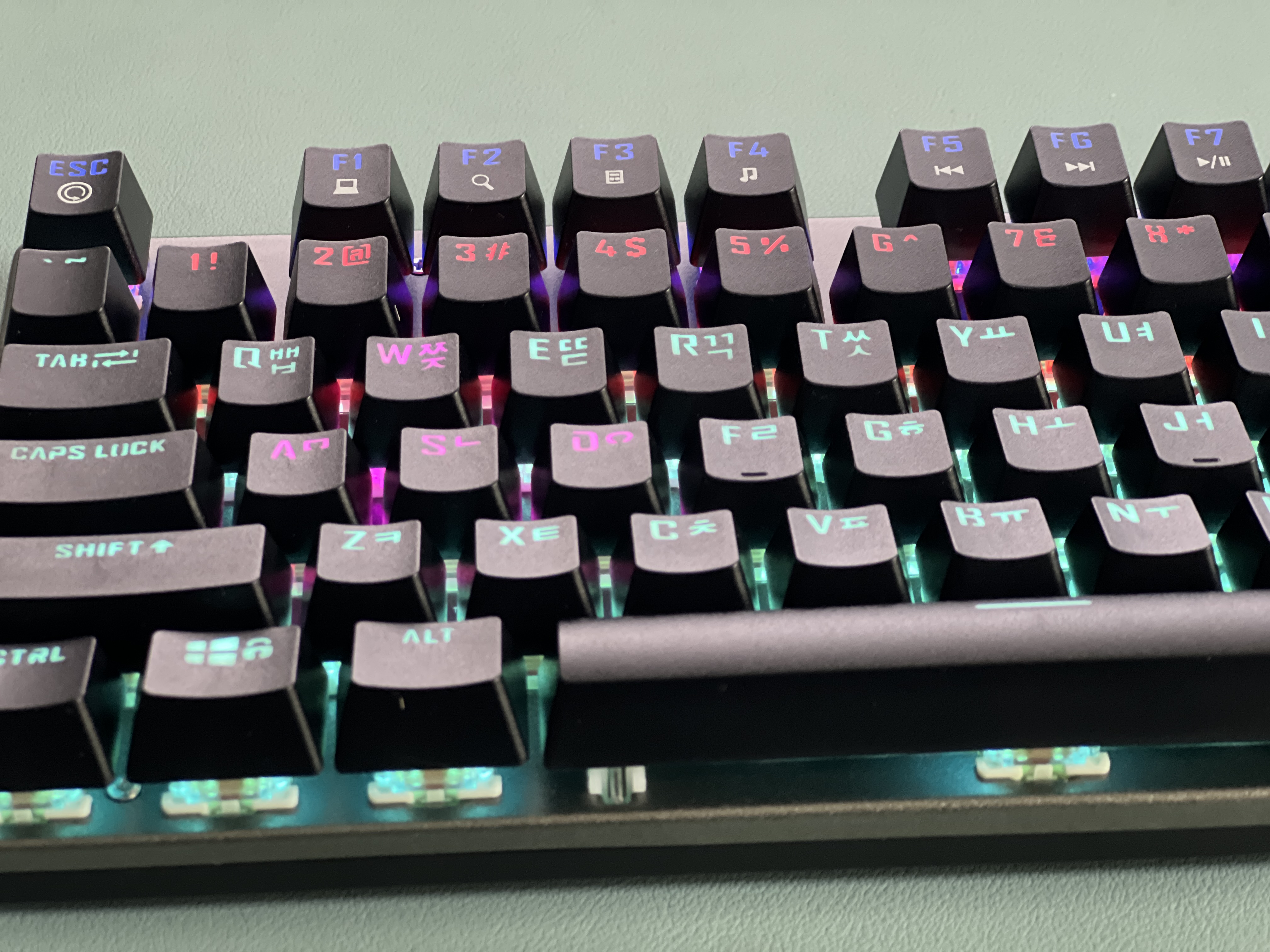 이 제품은 게이밍 기계식 키보드다. 그래서 터치감이 좋고 알록달록한 led 등이 키보드 치는 맛을 나게 한다. 구성이 적축. 청축. 갈축. 흑축이 있다. 나는 어느 정도 키감이 있지만 소음이 적은 제품을 선호한다. 그래서 적축을 구매했다. 청축은 키감이 매력적이지만 딱딱 거리는 소리 때문에 집에서 사용하기엔 무리가 있었다.