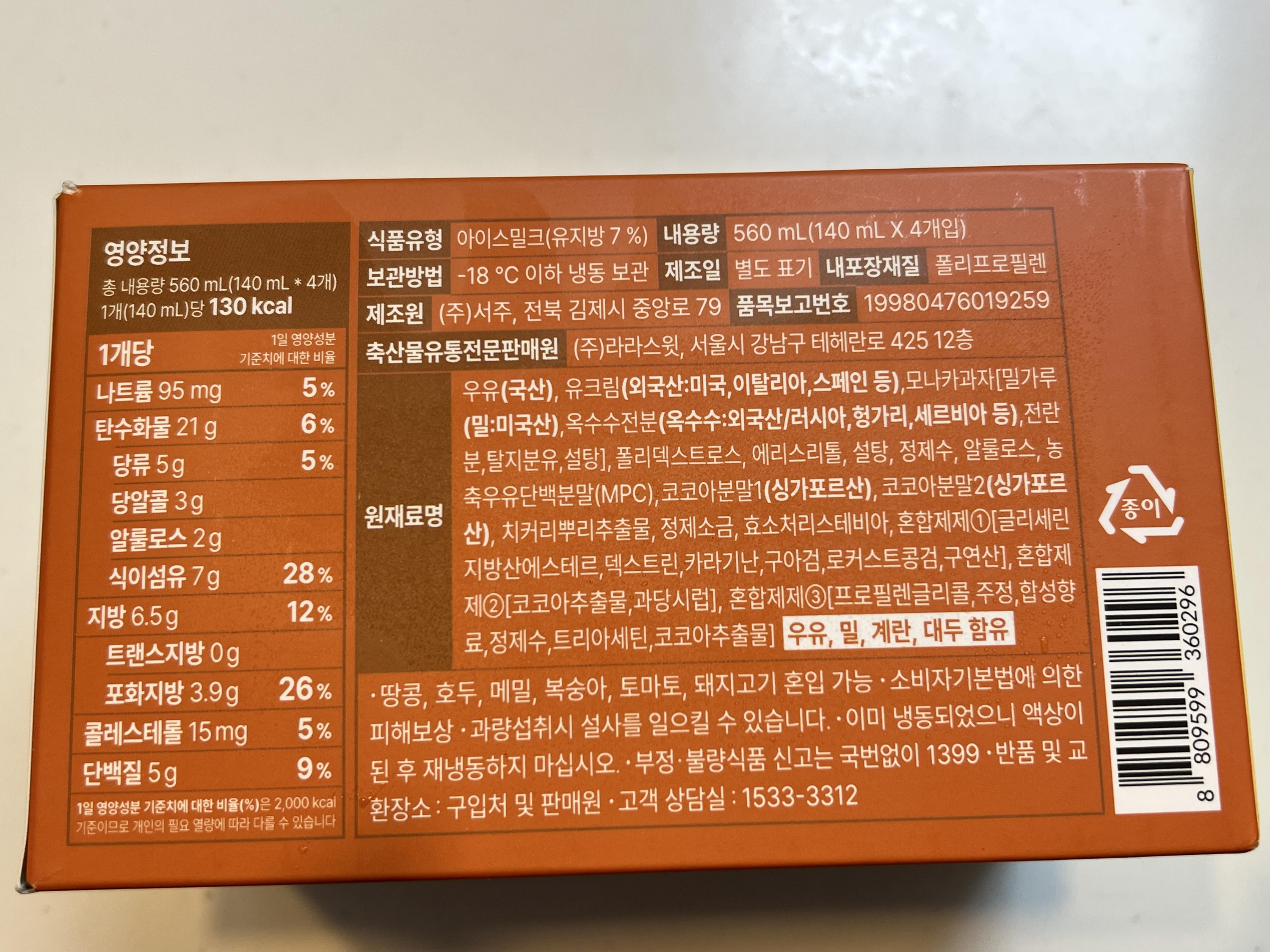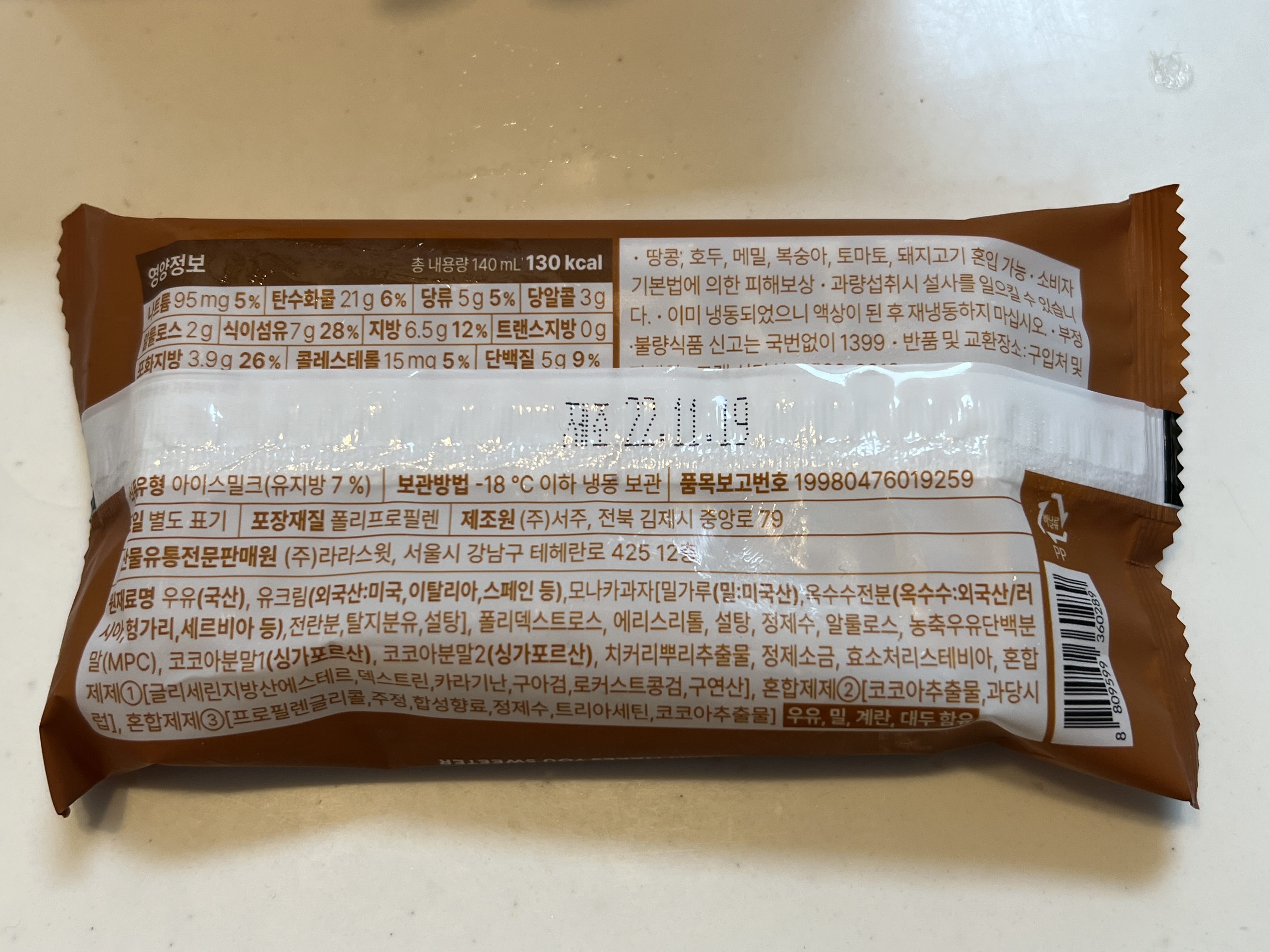 다이어트 중이거나 당뇨로 아이스크림을 먹지 못하는 분들에겐 매력적인 제품이다.일반적으로 보통 아이스크림들이 300~400kcal을 훌쩍 넘는다. 130kcal 의 저칼로리와 순수당 5g은 비교적 마음 놓고 먹을 수 있는 숫자다. 맛도 훌륭하고 살찔 걱정도 없는 "라라스윗 초코 모나카"를 추천드리고 싶다,