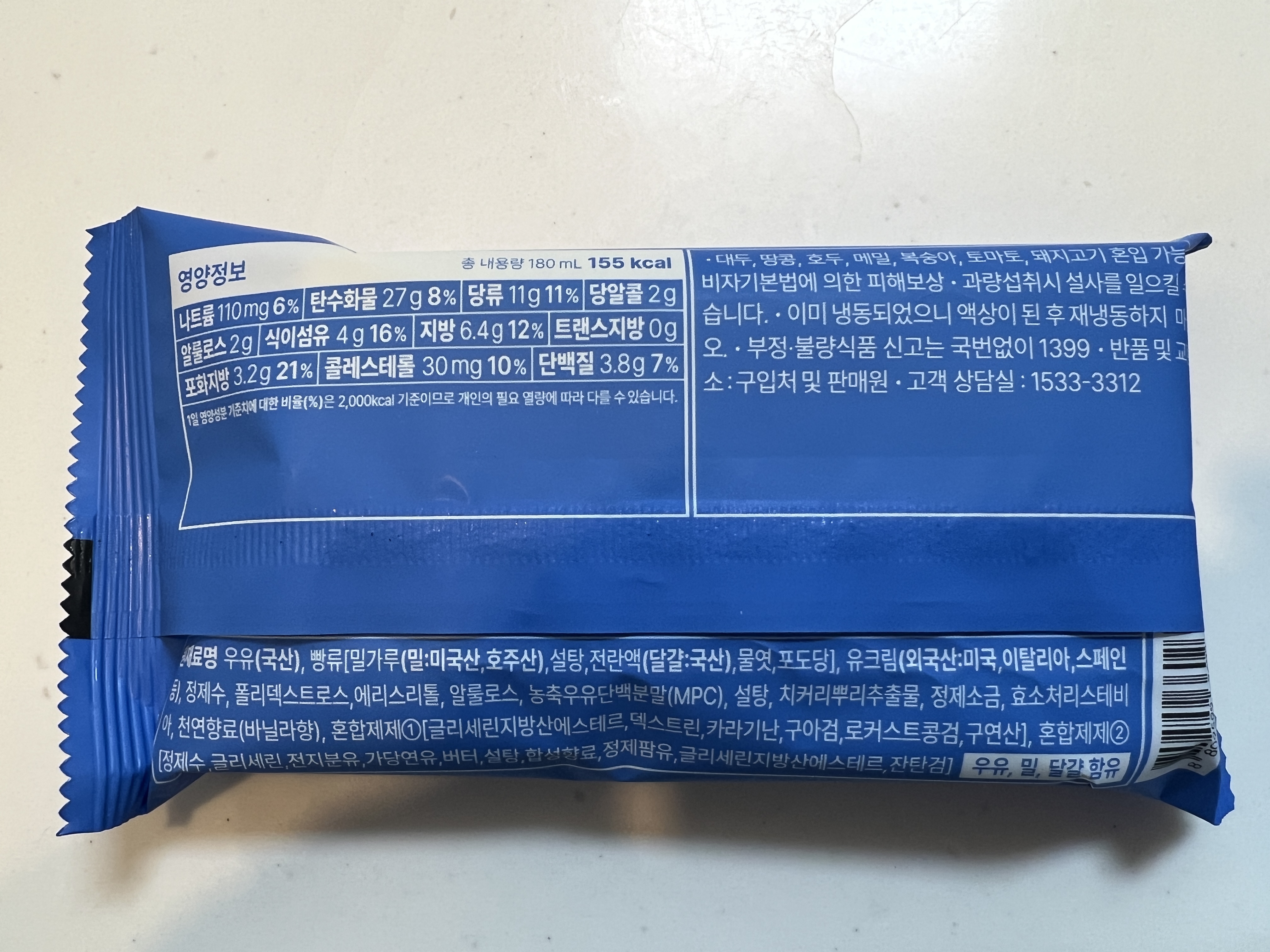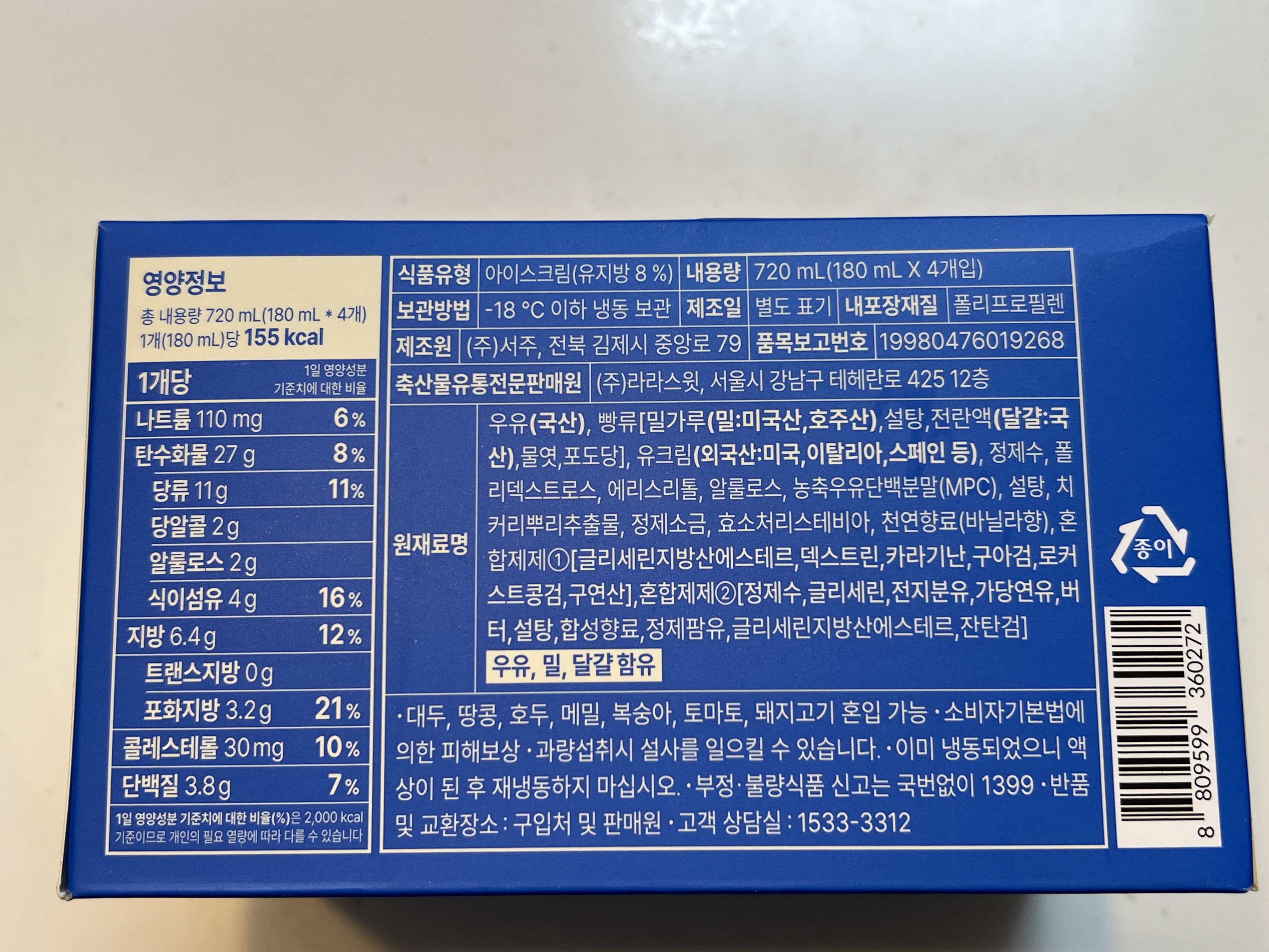 1개 155 kcal 이라는...보고도 믿기지 않은 숫자다. 아이스크림이 대부분 300칼로리를 훌쩍 넘는데 비하면 거의 절반수준의 아이스크림 칼로리다. 이 정도면 하루에 하나 정도 먹어도 다이어트에 크게 무리도 없고 입터짐도 방지할 수 있다.