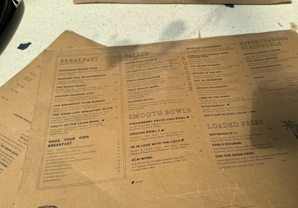메뉴를 펼쳐보니 현지 음식부터 서양식 브런치까지 다양하게 갖춰져 있었다. 건강하고 가벼운 스무디볼 종류부터 버거, 샐러드, 파스타, 스테이크 같은 든든한 요리, 그리고 인도네시아식 메뉴까지 골고루 있다.