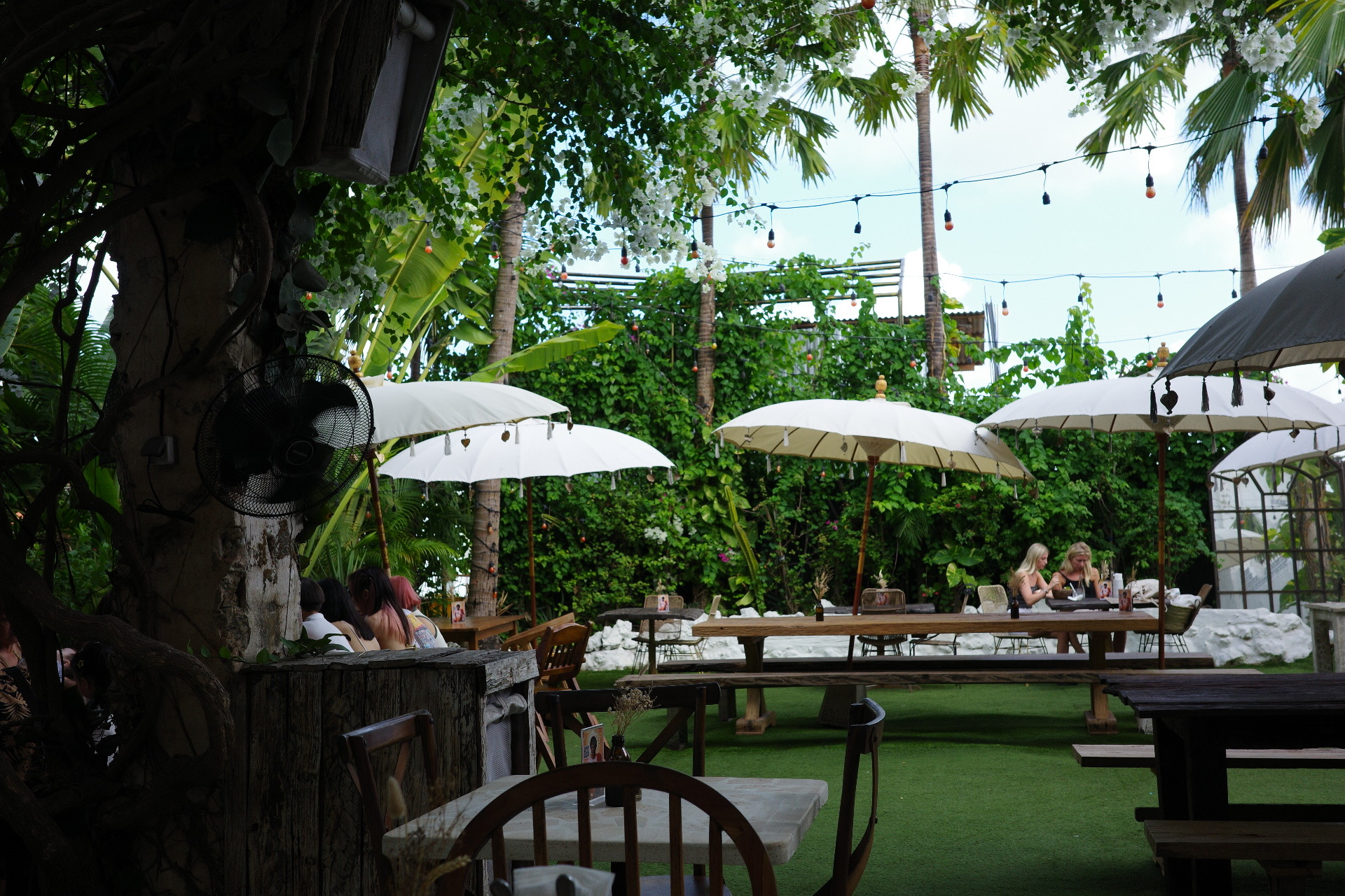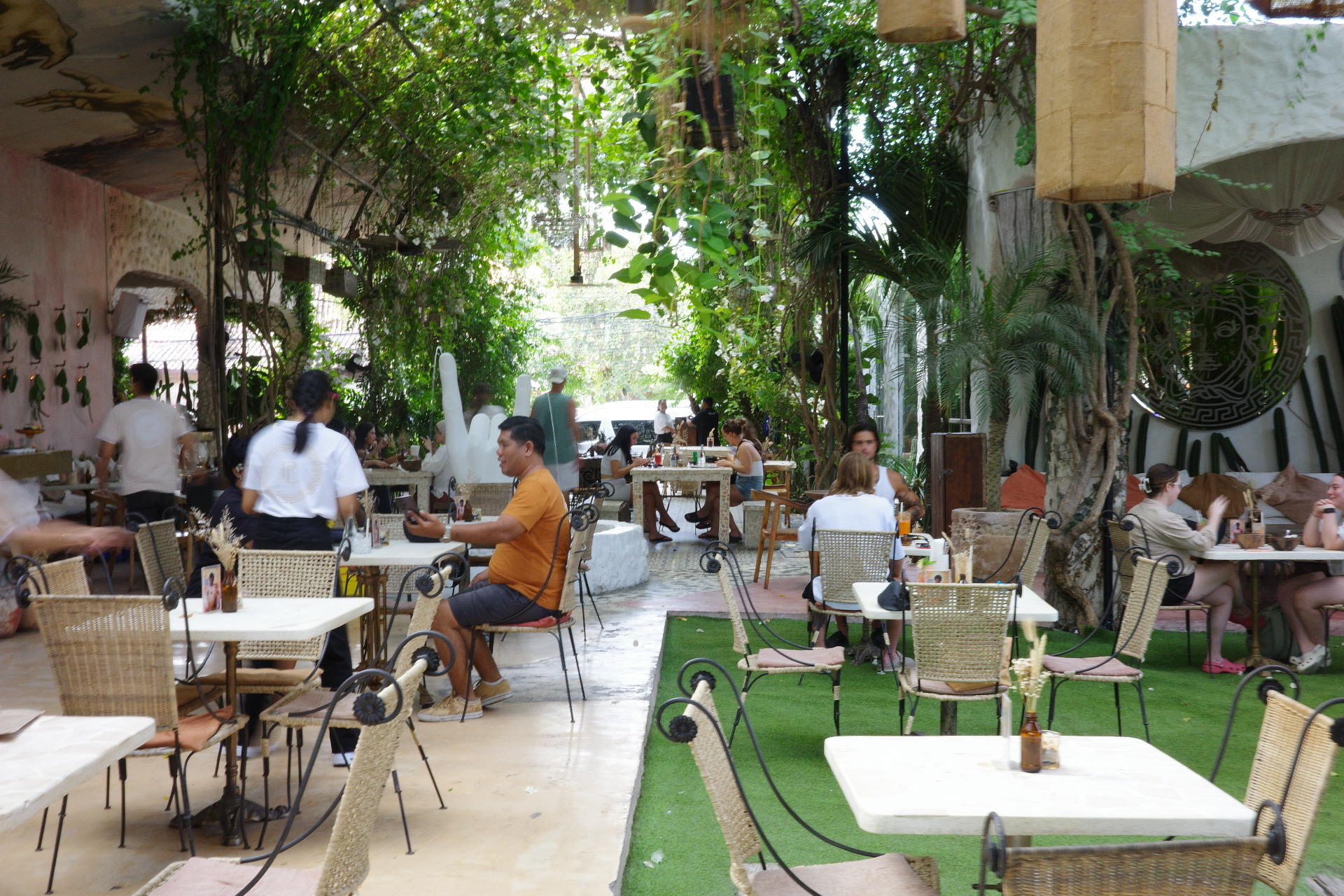 가게에 들어서는 순간 탁 트인 통유리 천장과 실내 가득한 초록 식물들이 눈에 들어왔다. 보헤미안 감성으로 꾸며진 인테리어가 정말 인상적이었다. 자연광이 쏟아져 들어와 사진이 예쁘게 나오고, 곳곳에 야자나무와 꽃 장식, 빈티지 가구들이 조화를 이루고 있었다.